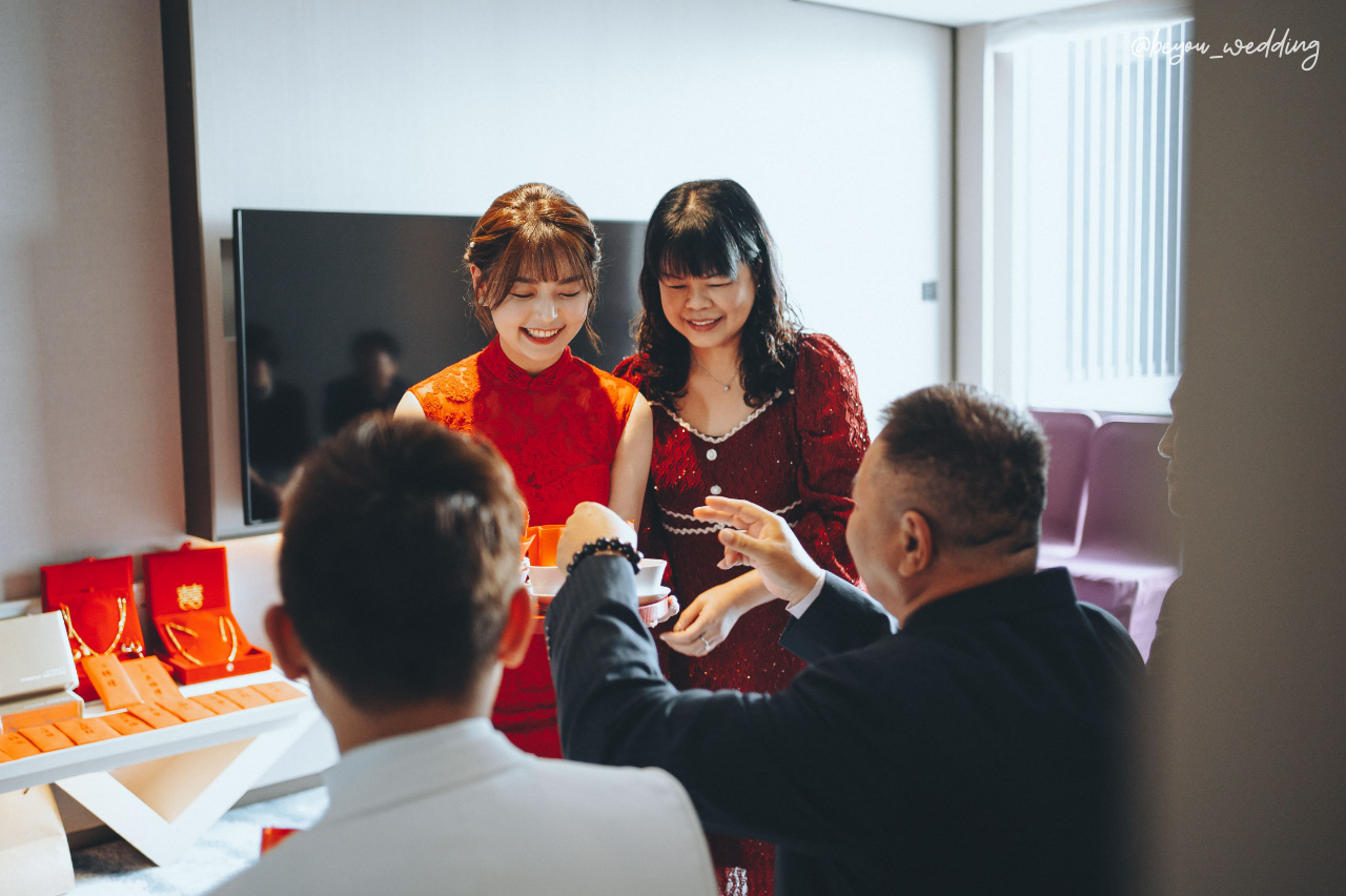 儀式流程:可依家庭狀況簡化,常見流程如奉茶、交換戒指、穿金戴銀、交換聘禮等。