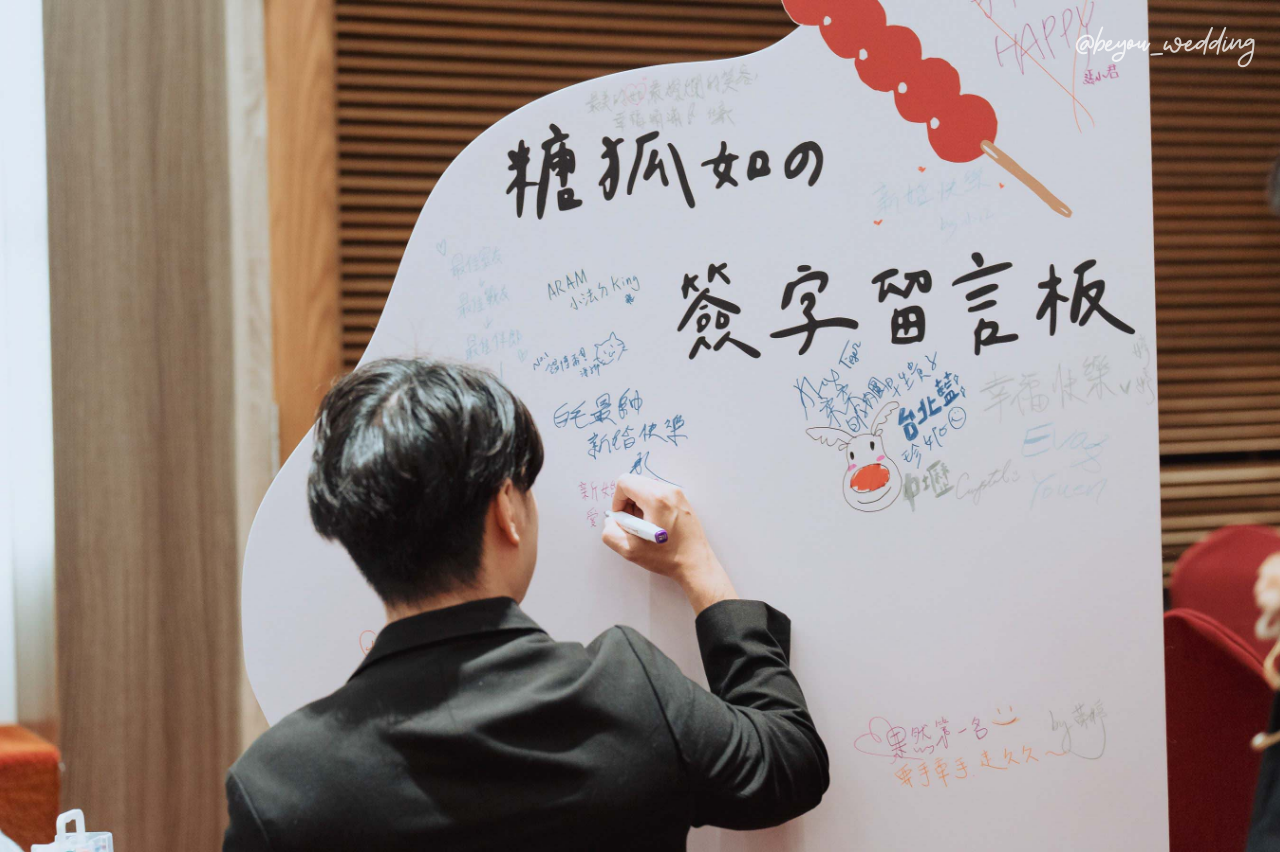 新人以彼此名字諧音設計「糖狐如(葫蘆)」留言板,邀請賓客留下字跡與插畫。